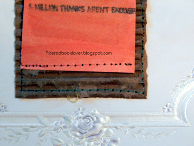 The bottom layer was a gift from my neighbor across the street. When her daughter was planning to get married, my neighbor got samples of wedding invitations and announcements from several companies. Upon her decision, she asked if I wanted the samples. Never one to refuse collage fodder, but not knowing how I would use the announcement in my art, I gave a resounding yes I would gladly take the samples. I began by deconstructing the outer layer of the card face. I had to find a way to hide the sample announcement and the corrugated cardboard was the perfect size to hide everything. Everything was sewn together using variegated thread.