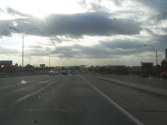 On the interstate during rush hour, the end of day presented a lovely view of the sun trying to peep through.