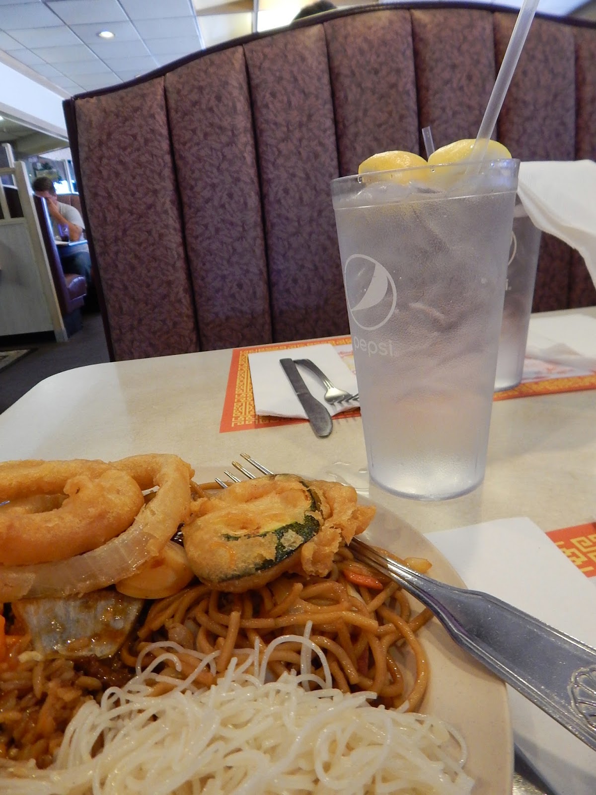I did manage to get this photo of our waters Sally ordered while I took photos of the restaurant. When I paid the bill, I was shocked. It was $22.88 for the two of us, which didn't include tax and tip. $11.44 per person is dinner prices in my town, not lunch prices. And the food wasn't even that good, especially since Sally was ready to leave after I finished this one plate. She'd had three plates, which included her dessert that I never got. But I had no intention of complaining, because it was a fun day out and about, and the car and I both had a chance to get a bit of much needed exercise.