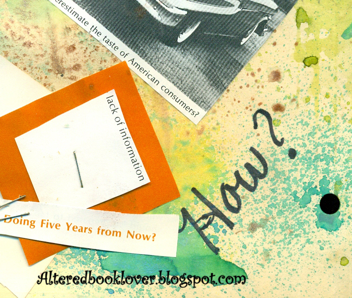 After a rather dubious start, I ended up creating this silly, silly journal page from a used file folder, an economics book (found in a stack of books headed for the dump) published in 1962, two magazines, handmade shimmering mists, and staples. Can you count all the staples I used? I actually know the answer to that question!